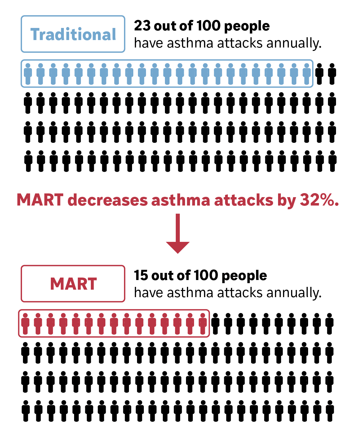 Multiple clinical trials show SMART reduces the risk of experiencing asthma exacerbations requiring systemic corticosteroids, ER visits, and hospitalizations.