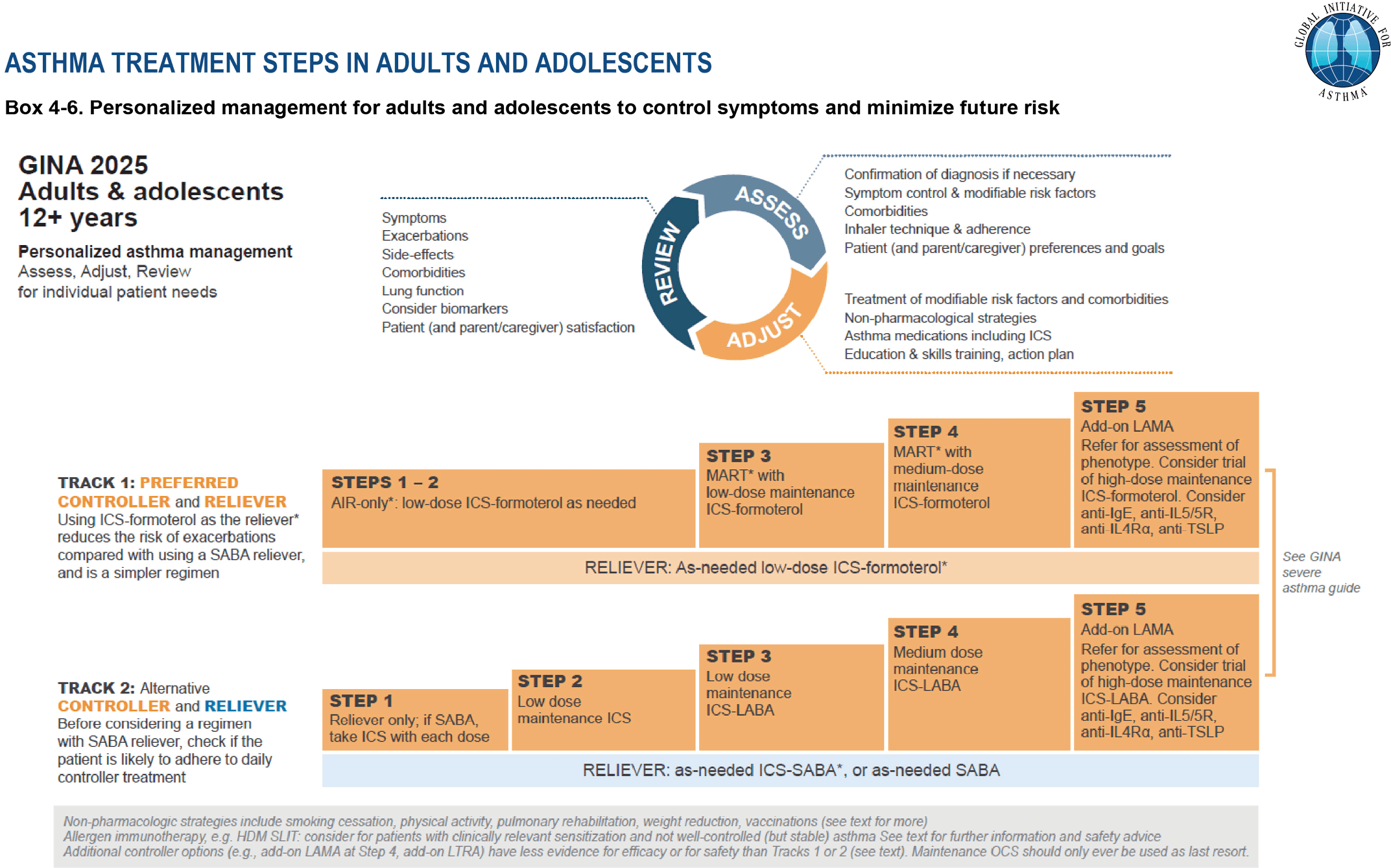 GINA (Global Initiative for Asthma) 2025 recommendations for the management of individuals at least 12 years old with asthma. GINA 2025, reproduced with permission. Available from www.ginasthma.org.